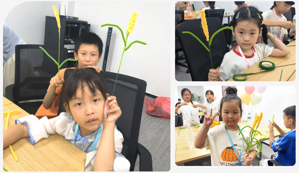 下午的时光同样充实而美好。放映厅里,《哪吒》中“我命由我不由天”的热血画面点燃了孩子们的眼睛,《机器人总动员》里的温情故事又让他们静静依偎,光影流转间,时而响起清脆的笑声,时而传来小声的惊叹,每个孩子都沉浸在动画世界的奇妙旅程里。创意手工课上,扭扭棒在孩子们手中变成了金色的麦穗等各种造型,孩子们举着作品互相展示,成就感十足。
